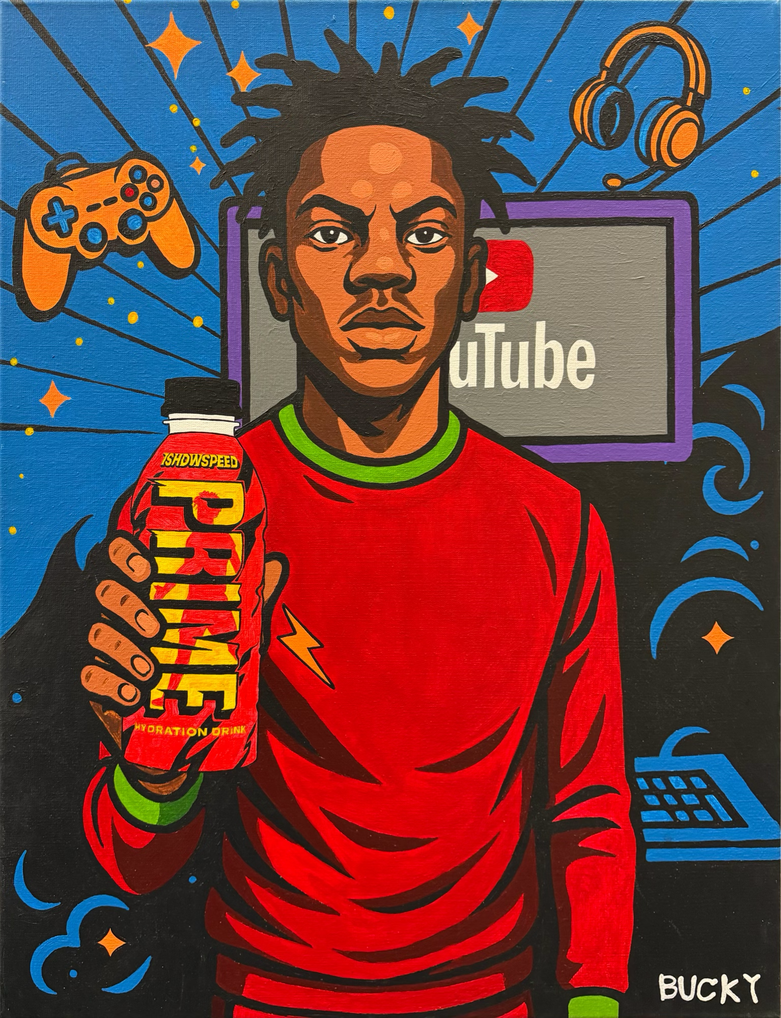 By elevating a fleeting internet phenomenon onto canvas, Bucky freezes a moment that was designed to move fast. In doing so, ISHOWSPEED becomes less about hydration and more about hunger — for attention, belonging, and the next cultural high.