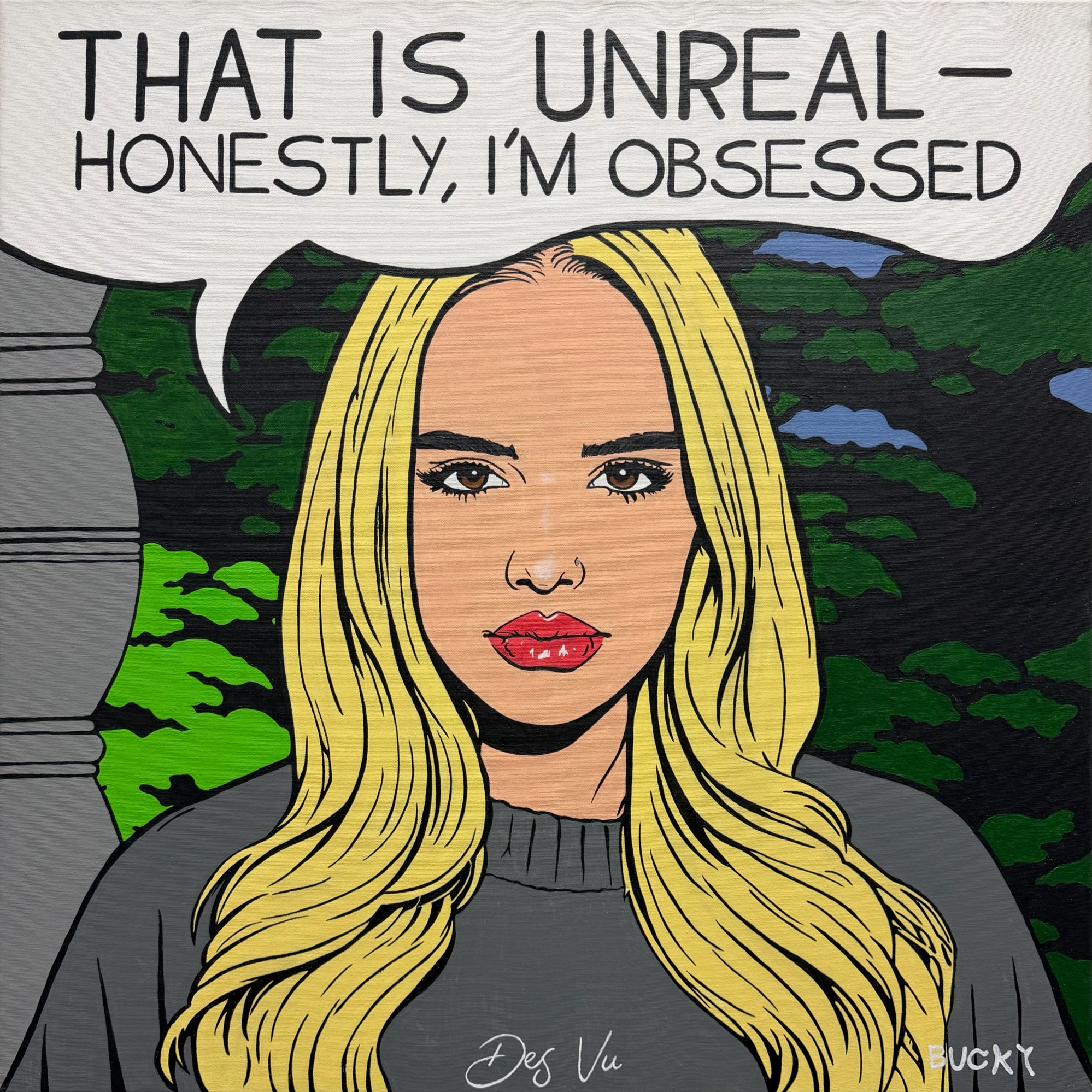 K.C.J is a contemporary pop-art portrait inspired by Kaci-Jay Conder, a rising digital creator best known from the hugely popular YouTube family channel Dad V Girls. Drawing visual inspiration from the bold graphic language of classic comic-strip pop art, the painting reimagines the traditional comic heroine as a modern cultural figure shaped by social media, youth influence, and family-driven storytelling. Through strong outlines, confident colour, and a direct gaze, the work presents a figure who feels both familiar and symbolic of a new era of celebrity—one built not through traditional media, but through connection with audiences online.