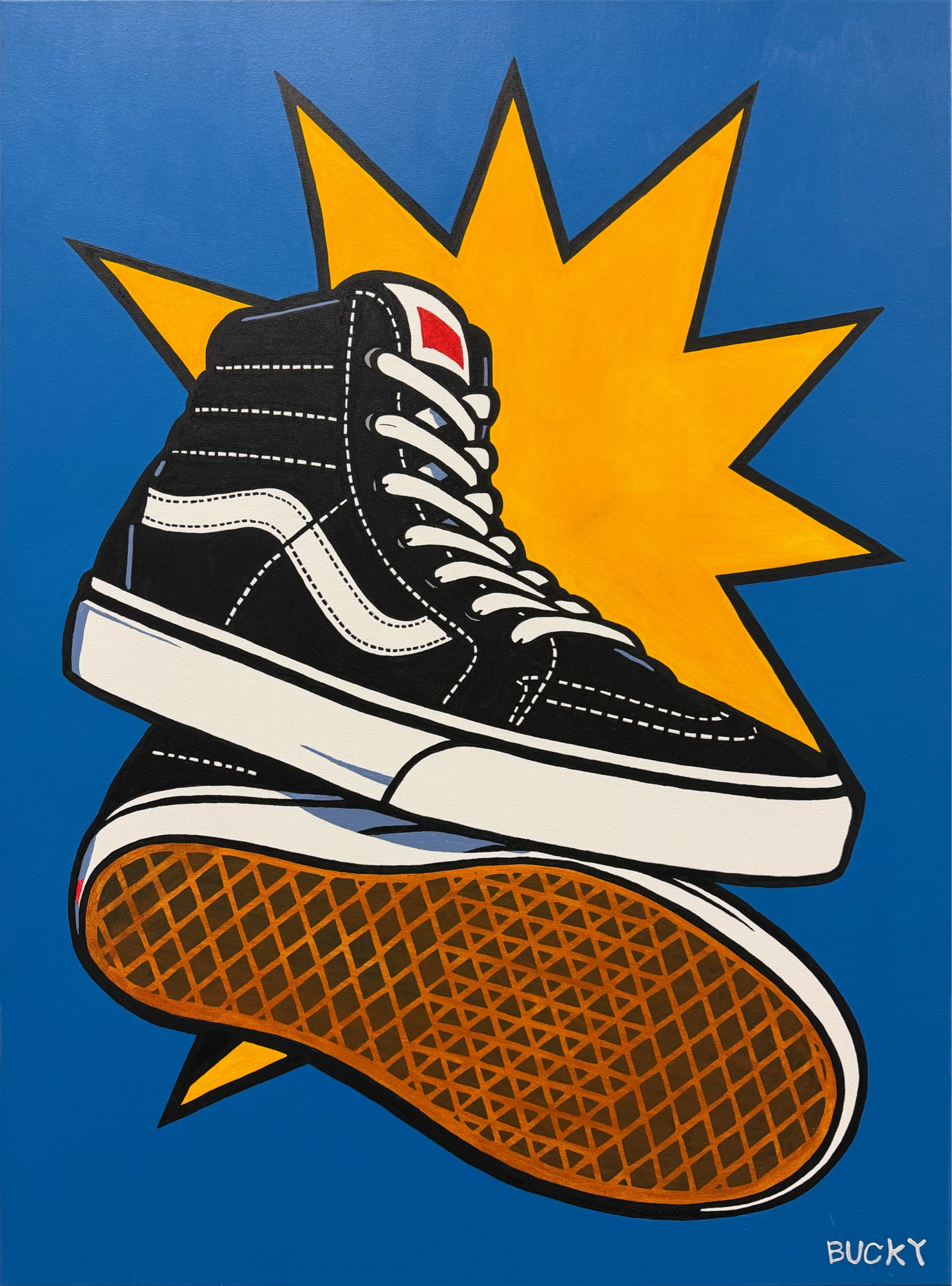 In VOWS, Bucky presents a bold contemporary reimagining of Roy Lichtenstein’s iconic Pop Art painting Keds. The work pays direct homage to one of the most recognisable visual languages of twentieth-century art, while simultaneously shifting the cultural reference point firmly into the present day. Where Lichtenstein’s original painting celebrated the everyday commercial object of its era — the humble Keds trainer — Bucky replaces the footwear with Vans Off The Wall sneakers, a brand deeply embedded in contemporary youth culture and personal identity.